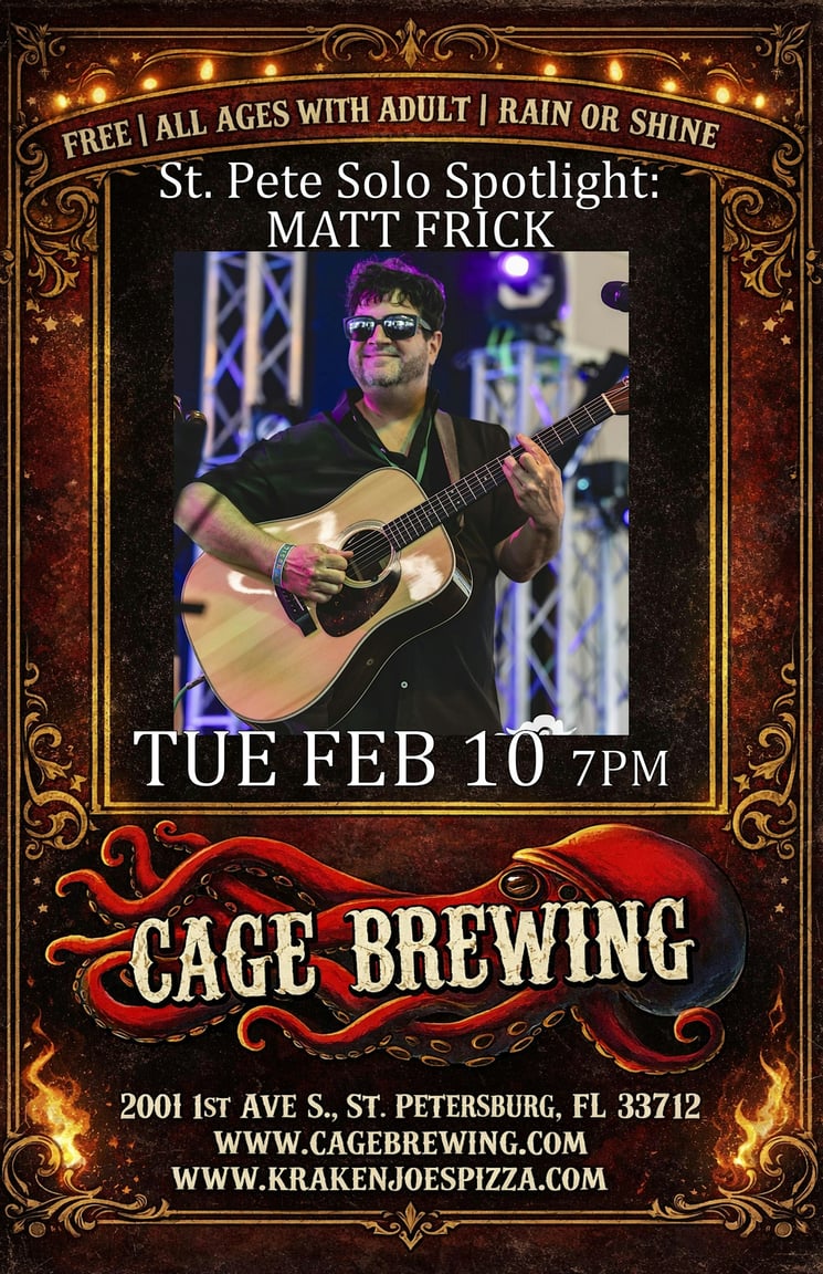 Tuesday night Feb 10th at Cage Brewing, we shine the light on one of our own — Matt Frick — bringing it down to the essentials with a solo set full of songs, soul, and vibe. Kraken Joe's Pizza to boot!